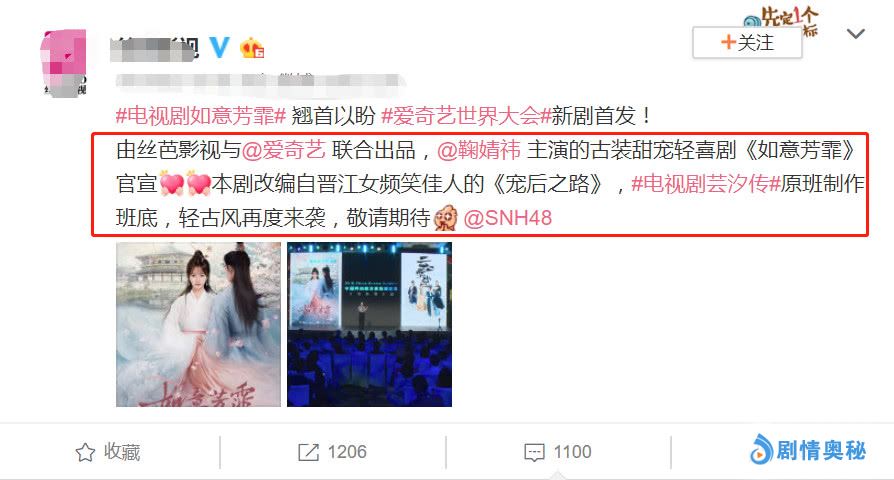 从网上发布的照片就可以看到这鞠婧祎新剧是《如意芳菲》, 而据悉额这剧是《芸汐传》的第二部,而且这演员阵容将会是《芸汐传》的原版制作班底,可见这部剧的质量问题是妥妥没问题了。而且这部剧还是改编自小说《宠后之路》,光看这剧名就知道这剧情真的是很精彩。