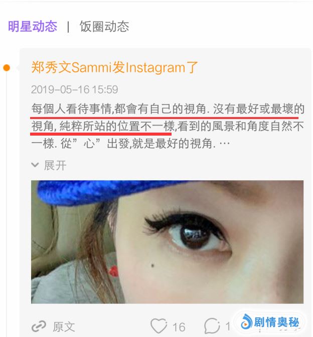 5月16号下午,平台系统提示郑秀文刚刚在外网社交平台发文了,郑秀文说每个人看待事情,都还有自己的视角,并没有最好的或最坏的视角,纯粹所站的位置不一样,看到的风景和角度自然不一样。郑秀文表态说:从“心”出发,就是最好的视角。