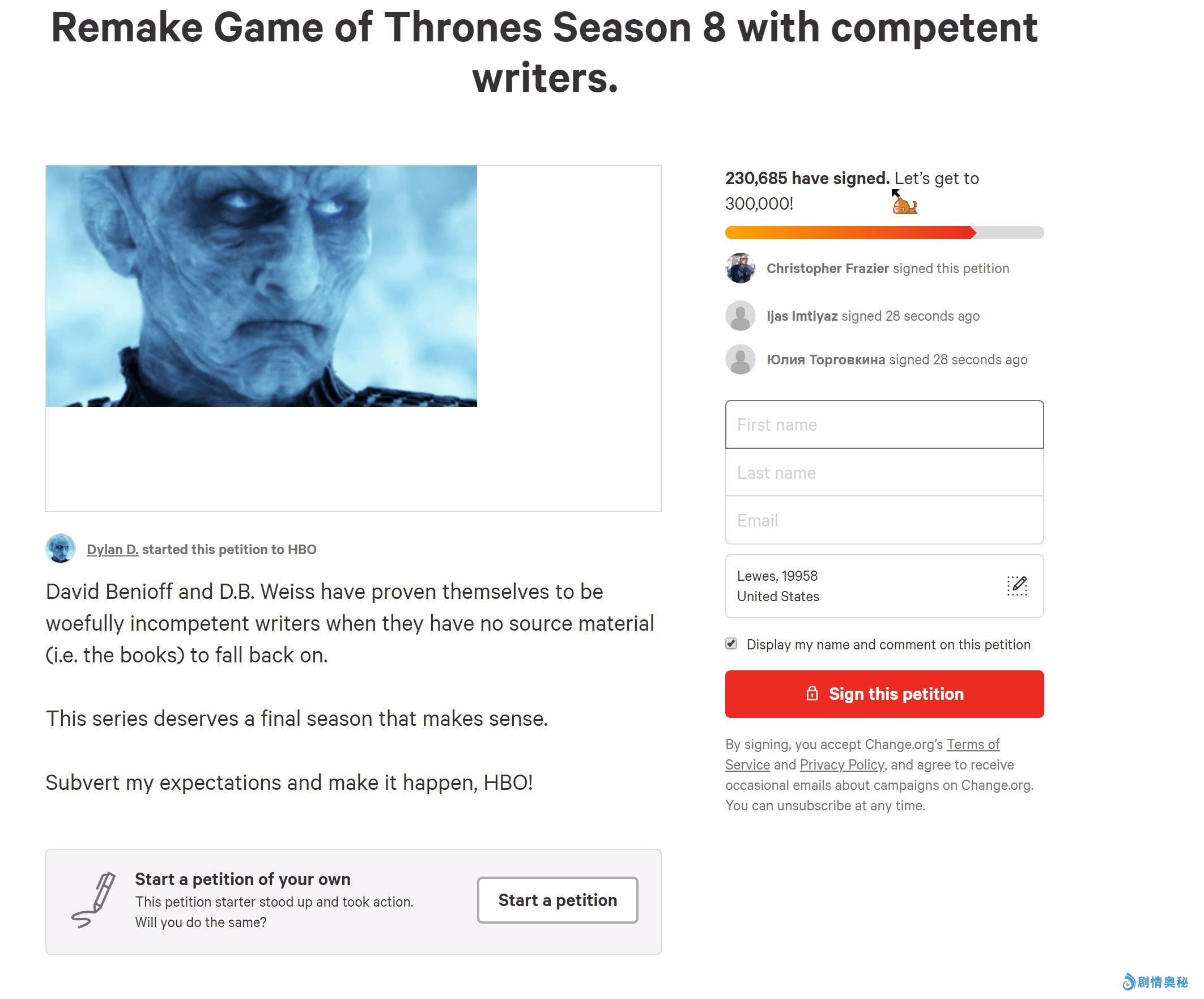 近日,有网友发起请愿,要求HBO换编剧重拍第八季。请愿上称:“David Benioff和D.B. Weiss已经证明没有原著小说加持,俩人根本就配不上编剧的称号。这部剧值得一个更好的最终季大结局。”请愿发出后几天已经吸引了4万多人签名。而现在被媒体报道后,已经瞬间暴增到23万,而且还在持续暴涨。