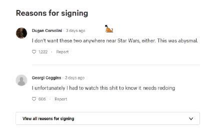 目前请愿下最火的一条留言是希望这俩人不要去祸害《星球大战》系列,并称这一切“简直糟糕透顶”。而这全因迪士尼和卢卡斯影业不久之前确认《权游》的这两位编剧将负责2022年的全新《星球大战》。