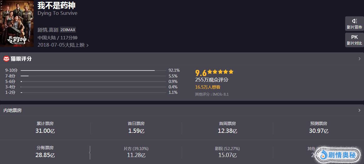 《我不是药神》是去年票房最炸裂影片之一,首日1.59亿达到了大爆级别,首周12.38亿元,最终票房狂轰了31亿元。该成绩排名年度第三位,仅落后《唐人街2》33.97亿,《红海行动》36.5亿,历史排名第七位好成绩。