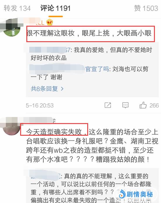 粉丝们对杨紫工作室意见很大,主要是嫌弃杨紫这次造型失败,还有就是杨紫的眼妆和发型,这些都成了粉丝们的吐槽点。粉丝表示:很不理解这眼妆,眼尾上挑,大眼画小眼!