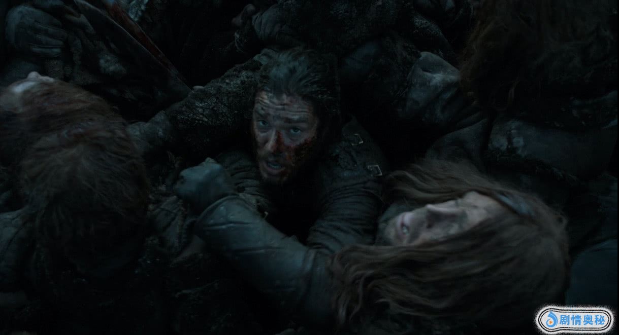 这场大战双方的实力是不对等的,小剥皮的是“正规军”,战斗力强,雪诺有野人支持,但更像是杂牌军。这场决一死战打的非常惨烈,真钱的马匹和人的尸体越来越多,堆成了小山,所有人都杀红了眼,雪诺被埋在死尸堆里,绝望到几乎窒息。这也是《权游》的一大特点,有大场面,但更多的是营造气氛,让观众感受到荧屏内的紧张和绝望。