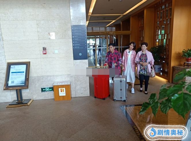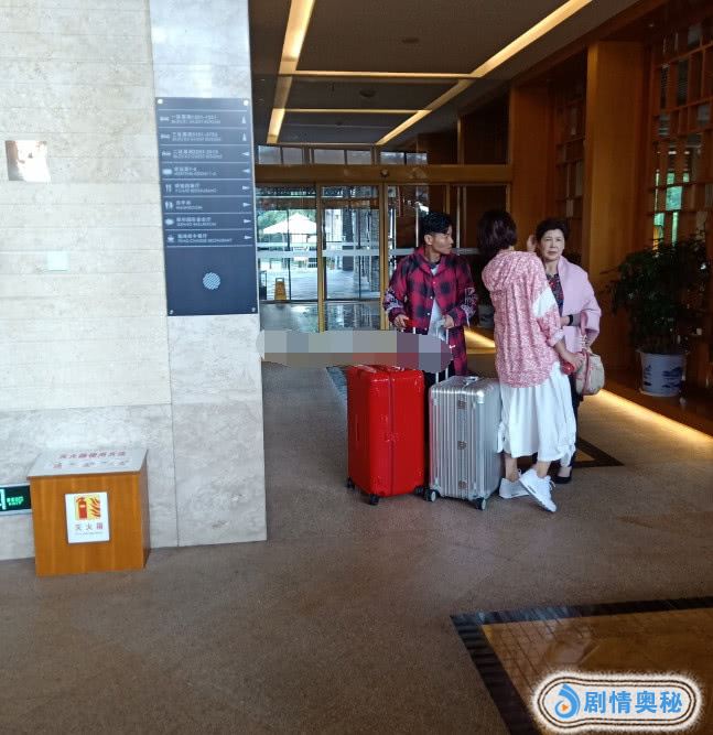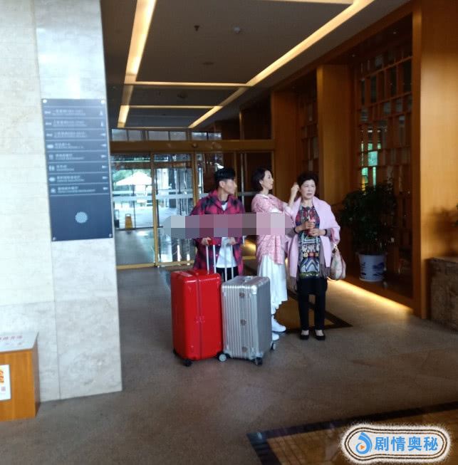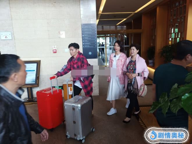 张晋身穿一件红格子长袖上衣,双手推着两个大大的行李箱,转头看着妈妈和妻子蔡少芬。蔡少芬当天造型很漂亮,粉色上衣搭配白色长裙,脚踩白色平底鞋,正在为婆婆整理发型。