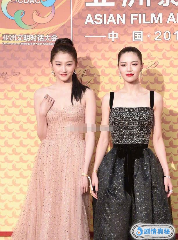 钟楚曦的肩膀是条直线,这也叫”直角肩“,她和关晓彤一起走 红毯简直是秒杀。钟楚曦的直角肩配上这黑色吊带礼服,真的是行走的衣架;反观关晓彤虽然是抹胸礼服,但是在钟楚曦身边真的只能是陪衬。