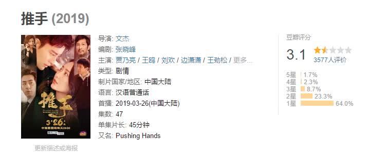 《推手》是接档爆款热剧《都挺好》在3月26日播出,收视率其实还不错,两台星级卫视同时播出,最后一周双台破1,只是口碑却一路走低,64%的网友打出了一星的差评。