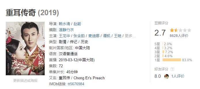 《重耳传奇》是今年目前为止口碑最低的一部剧,83%的人打出了一星差评,综合评分2.7,主演王龙华出道时间挺长,但是人气和热度很低,却请到了王艳、王刚、林永健等演员做配角,该剧长达72集,并在星级卫视开播,资源很好但剧不争气,照样扑街。