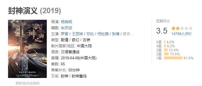 最后要说的就是《封神演义》,收视率屡屡破1,一直高居同时段第一名,网络播放量也高居榜首,但口碑很低才3.5分,该剧将大家熟知的神话剧改得面目全非,主演成了杨戬,并且和妲己谈起了恋爱,九尾狐不再是女子而是男人,妲己不再魅惑反而清纯,迷惑纣王是为报灭门家仇。