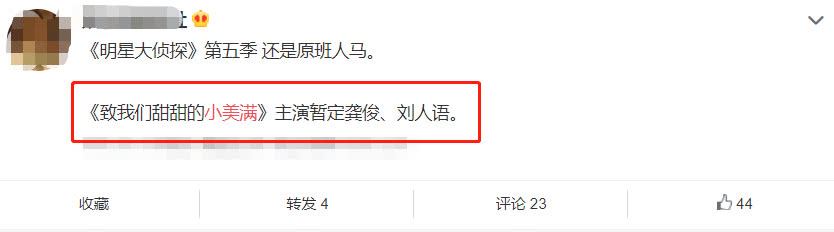 这部剧就是《致我们甜甜的小美满》啦,和《小美好》以及《小时光》甜度可以一拼。因为这部剧是改编自《周而复始》,也就是《致我们暖暖的小时光》以及《致我们单纯的小美好》同一个系列,这三个作品都是同一个作者构写滴,所以说这甜蜜度自然不言而喻。虽然说这部剧还没有官宣到底是主演是谁,但是从网络大v爆料的消息称,此次出演男女主演的分别是龚俊和刘人语。