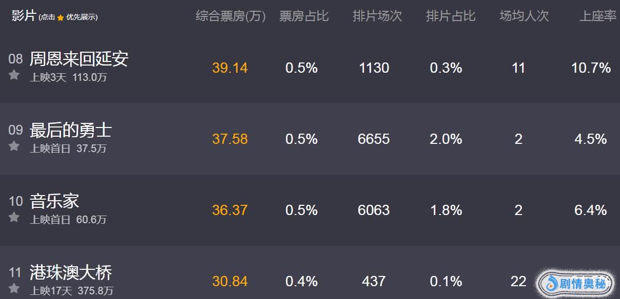 今天周五新开画了7部新片,除了《一条狗的使命2》票房收了1804万(截止21点30),其他6部都成为了炮灰走过场。其中票房成绩最让人失望的要数这部历史剧情片《音乐家》,该片云集了硬汉胡军,袁泉等巨星,想不到才刚上映票房就扑街了,片方现在都无语了。