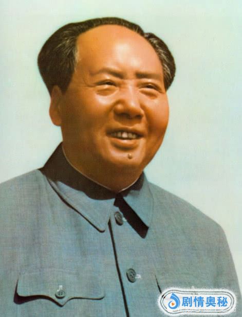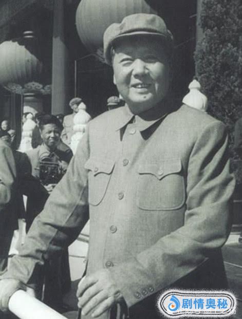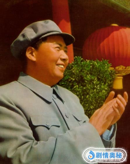 毛主席在天安门城楼上,对着镜头露出笑容。