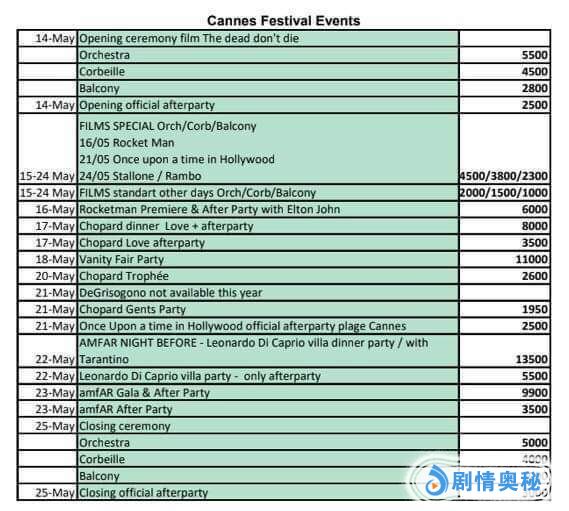 比方说,如果你想参加《火箭人》的红毯和映后派对,看到埃尔顿·约翰和塔伦·埃格顿的表演,那么需要出6000美元(约4万人民币)。从表中可以看到,最便宜的是1000美元(约7000人民币),最贵的是5月22日昆汀导演的《好莱坞往事》,价格是13500美元(约9.3万人民币),可能是因为皮特和小李子会到吧!