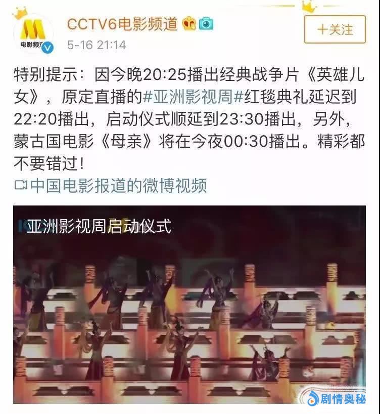5月16日晚,原定在CCTV6电影频道播出亚洲影视周红毯典礼,被临时延迟播出,而改为播出经典战争片《英雄儿女》。根据之前的节目预报,5月16日原本并没有《英雄儿女》的播放计划。