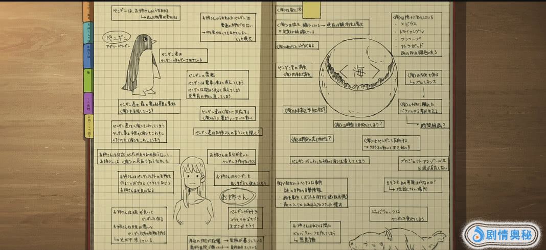 但是,《企鹅公路》绝非那种让成年人皱眉的无脑动画片,电影正视这个年龄开始的懵懂,以及对异性的好奇。他会在笔记本上记录自己对女性乳房的研究,牙科诊所里的大胸姐姐承载了银幕外观众在少年时代对异性的所有幻想,滨本、铃木和青山君三个人的关系是少年们情窦初开的真实写照。