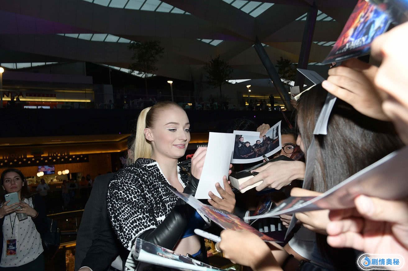 在粉丝见面会的红毯上,粉丝们早早入场,拿着各式周边、海报,或是直接Cosplay成自己最爱的X战警角色,等候苏菲·特纳与杰西卡·查斯坦的到来。活动过程中,二人还收到了极具墨西哥风情的礼物——两顶墨西哥传统宽檐帽,帽檐上分别印有“苏菲”和“杰西卡”字样,颇感惊喜的二人还戴上帽子摆起了“超模pose”。