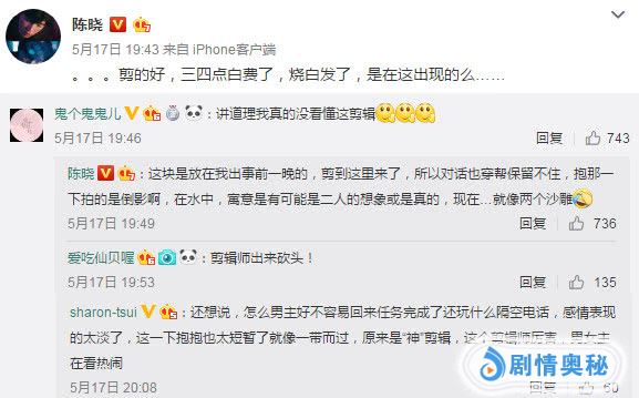 被剪辑搅得心累的陈晓甚至删除了大结局前更的微博。内容大概是想在收官后听一波来自粉丝的彩虹屁。没想到了却出现了如此想哭的局面。除了吐槽别无其他感言。这不仅是sky哥,也是观众们的意愿。毕竟前半段的剧情和节奏还是相当可以的。真觉得剪辑师可以出来挨打了,烂尾的锅大部分可以盖在他们身上。不说别的,在32集后集集闪回的,帮助观众回忆的节奏又是如何解释。有的网友还调侃自己的记忆比七秒还多,不用时刻被提醒。不觉搞笑!