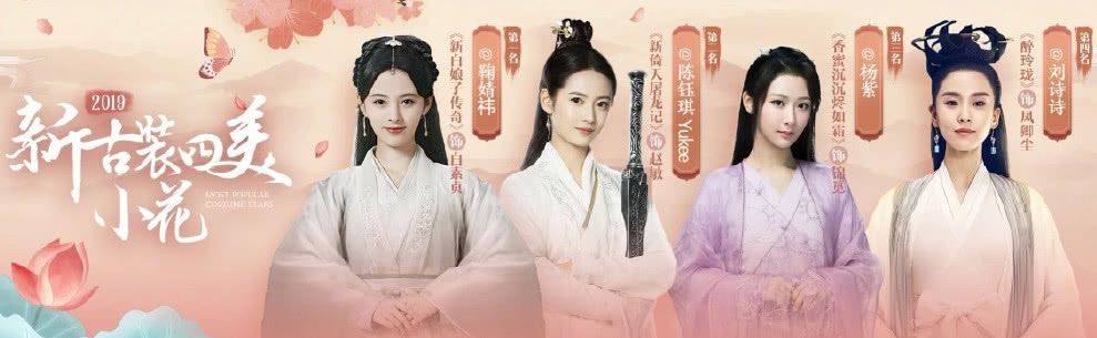 网选2019新古装四美小花是:鞠婧祎、陈钰琪、杨紫、刘诗诗。入围作品分别是《新白娘子传奇》《新倚天屠龙记》《香蜜沉沉烬如霜》和《醉玲珑》,其中除了《新白娘子传奇》和《新倚天屠龙记》都是2019年播出的新作品,《香蜜沉沉烬如霜》则是2018年播出的,而《醉玲珑》也已经是两年前的作品了,这个作品的时间跨度着实让人小惊讶了一把。毕竟是2019年新古装四美,还以为参选的作品和角色只限于2019年!