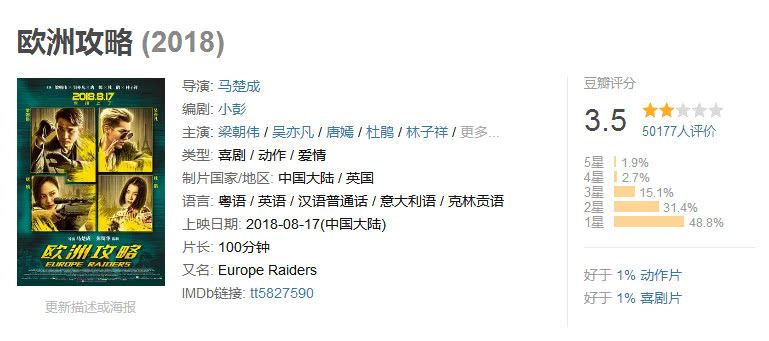 据悉,《欧洲攻略》制作规模全面升级,成本高达3亿,影片历时3年精心制作,前往全球多地取景,整体制作特别精良,可惜剧情台词都尬出天际,豆瓣评分仅3.5