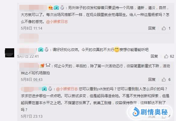 粉丝指责工作室没有用心在杨紫的妆发造型上,大家恨铁不成钢的急切,称每次出风格都不一样,在观众眼中就会觉得陌生,期待工作室能坚持一个风格,清新,自然,大方就好。更有粉丝表示心累,不指望您反黑了,就美工别错,妆容保持稳定,这样都达不到了吗?