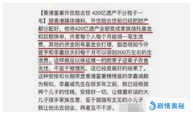 看上去李嘉欣花钱十分大手大脚,许晋亨也在一边没有组阻止,但是其实这两个人根本没有什么钱,他们的钱都是父亲许世勋给的,当时许世勋去世的时候就安排好了,将遗产变成了信托基金和巨额保单,每个月许晋亨和李嘉欣夫妇能领到200万左右的生活费,许世勋之所以这样做,就是害怕自己唯一的儿子被饿死。