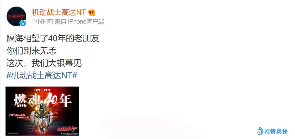 - 机动战士高达官微发布“燃魂40年”海报,40年后将首次在内地上映