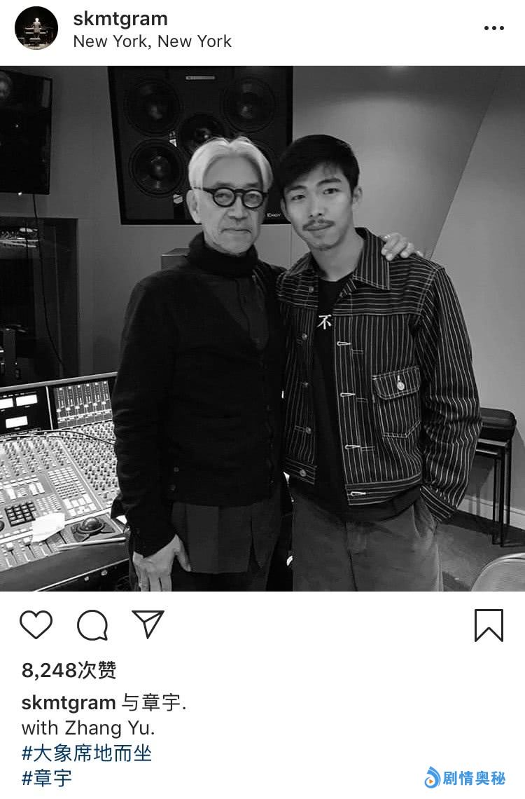 - 章宇与配乐大师坂本龙一合影,还带上了大象席地而坐