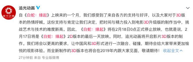 - 票房超4亿的白蛇:缘起2D版将停映,3D版本计划年内上映