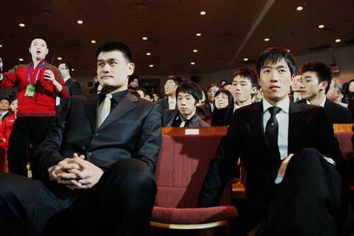 这个是姚明坐姿,刘翔站姿的照片,从这种角度和姿势下,并不觉得两个人有特别大的差距,看上去和谐不少。