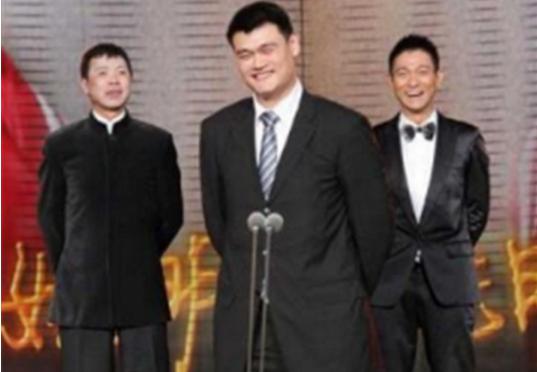 刘德华和冯小刚站在姚明身后的阶梯上,姚明站在阶梯下面,合影之后单看上半身,没有任何毛病,只要摄影师将脚下的阶梯忽略掉,就是一张完美的合影。
