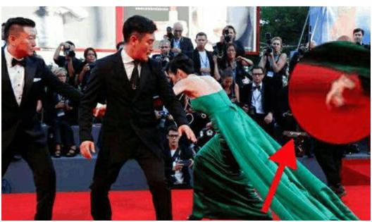 威尼斯电影节红毯当天景珂(原名梁镜珂)以一袭深绿色抹胸鱼尾长裙亮相,搭配珍珠饰品,造型上简约大方,身材窈窕有度,超长的裙尾非常吸睛。但俗话说的好“No zuo no die!”长裙最大的问题就是,不方便!就当她正风光地走在红毯上的时候,一个不小心,高跟鞋崴到脚,差点摔倒,结果从手包里掉出一个物件!